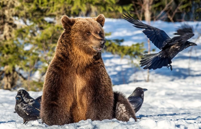In a rage, the bear roared himself up to his full height, tearing the cracked trees as he did so and sending them crashing down. He roared and thrashed, but still Raven clung on, one gnarled black claw twisted into the blood-soaked blond fur, the other stabbing with the knife until the bear in his rage flung his shoulders back and landed full on his back, the black bird leaping away just in time.